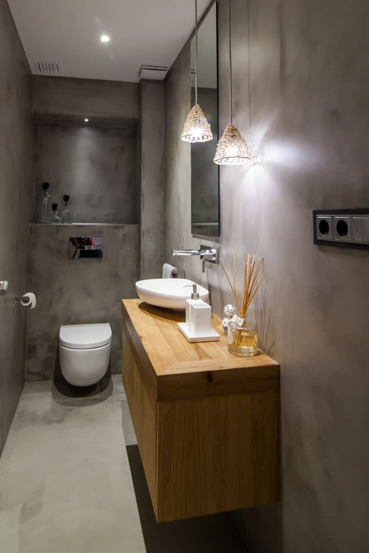 Para los amantes de los baños modernos pequeños, el microcemento se ha convertido en un aliado estético y funcional. En este baño, se utiliza en las paredes, con un innovador lavamanos hecho de madera, demostrando su versatilidad.