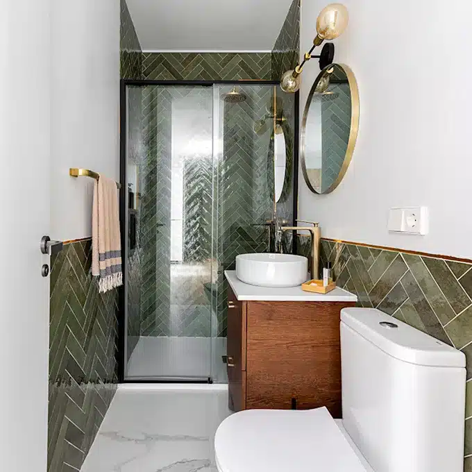 Se ha optado por un revestimiento en color verde con un acabado brillante para la ducha, una elección audaz que no solo añade personalidad al baño, sino que también aporta profundidad y carácter a la pared.
