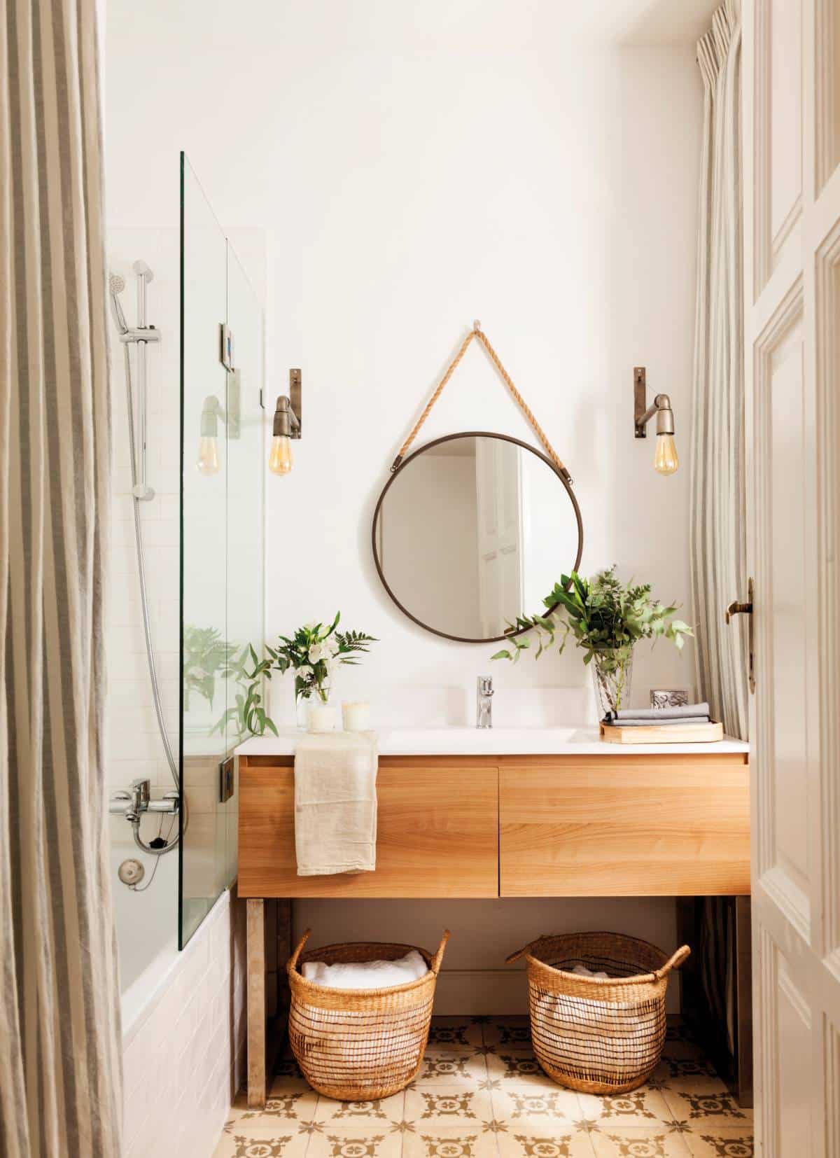 Un ejemplo es este baño con aires rústicos, donde el uso de la madera y piedra dan esa naturalidad al espacio, además las texturas brindan una atmósfera acogedora y sofisticada.
