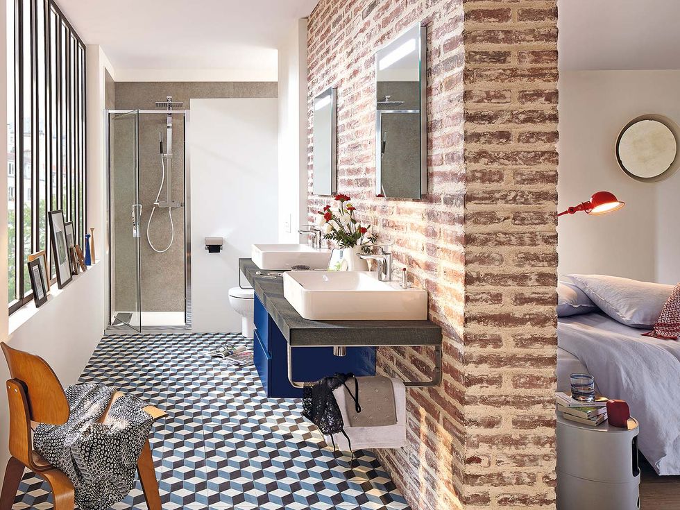 La elección de un lavamanos sobre una encimera suspendida añade ligereza al diseño, maximizando la sensación de amplitud. Además, este baño se atreve con azulejos blancos y un suelo de mosaico que le otorgan un carácter único y moderno.