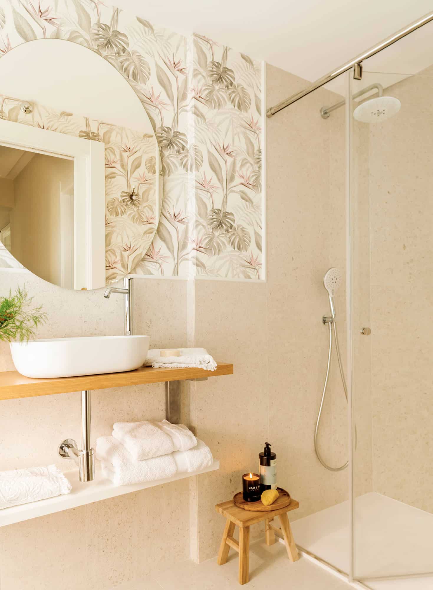 El espacio mantiene su amplitud y luminosidad gracias a la elección de omitir un tradicional mueble de baño. En su lugar, se han incorporado dos estantes que abarcan de pared a pared, permitiendo que el papel pintado sea el verdadero protagonista y facilitando el flujo de luz natural.