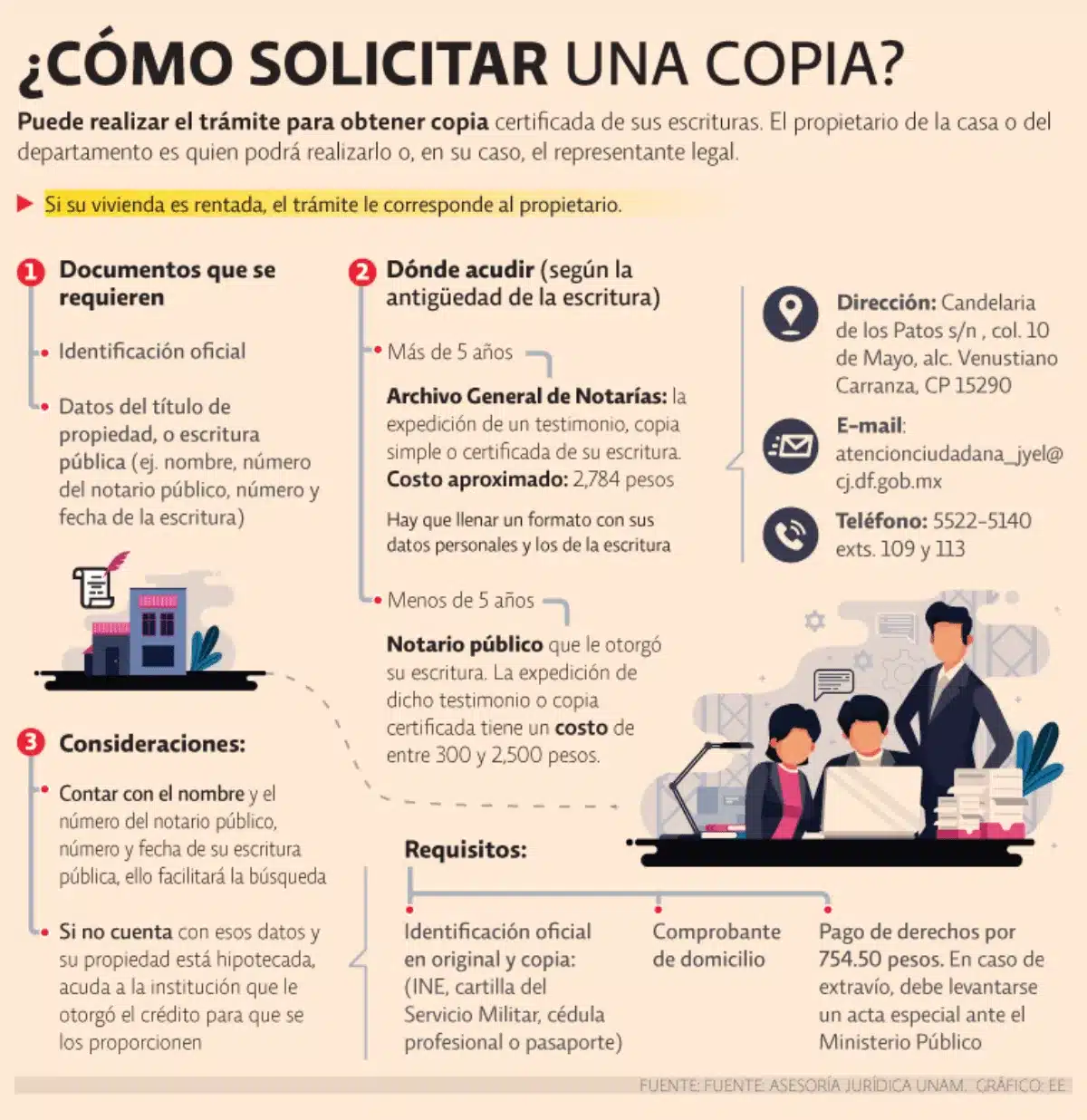 Puede contactarlos al teléfono 5522-5140 (extensiones 109 y 113) o vía email a atencionciudadana_jyel@cj.df.gob.mx. Es necesario llenar un formato con sus datos personales y los de la escritura. - Si la Escritura tiene Menos de 5 Años: